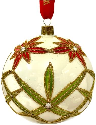 The glossy ivory ball features red poinsettias with green and gold accents