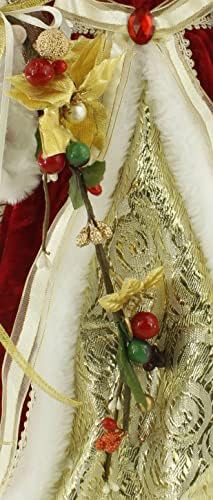 This Angel brings peace and serenity to the Christmas season. Her elegant deep red gown is matched with a brilliant golden dress. The delicate expression on her face exudes love, peace, and harmony. She is holding a large floral garland with golden flowers, with red, green, and gold berries. And her buttery soft wings and small ruby red bead trim around the neckline of her gown and her waistline add to her angelic appearance. Her style design matches exactly to the “Windy Hill Collection Name List Santa 416030”, as a pair representing the true Christmas spirit. She can either stand firmly on a tabletop, or can adorn the top of a Christmas tree as a tree topper. Welcome this red floral Angel to spread the true Christmas spirit into your home.